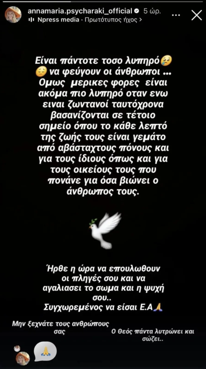 Δύσκολες είναι οι τελευταίες ώρες για την Άννα Μαρία Ψυχαράκη, η οποία έγινε ευρέως γνωστή μέσα από την συμμετοχή και τη νίκη της στο Big Brother, καθώς, όπως αποκάλυψε μέσα από ένα story στον προσωπικό της λογαριασμό στο Instagram τα ξημερώματα της Παρασκευής 29 Αυγούστου, έφυγε από τη ζωή ένα πολύ αγαπημένο της πρόσωπο.