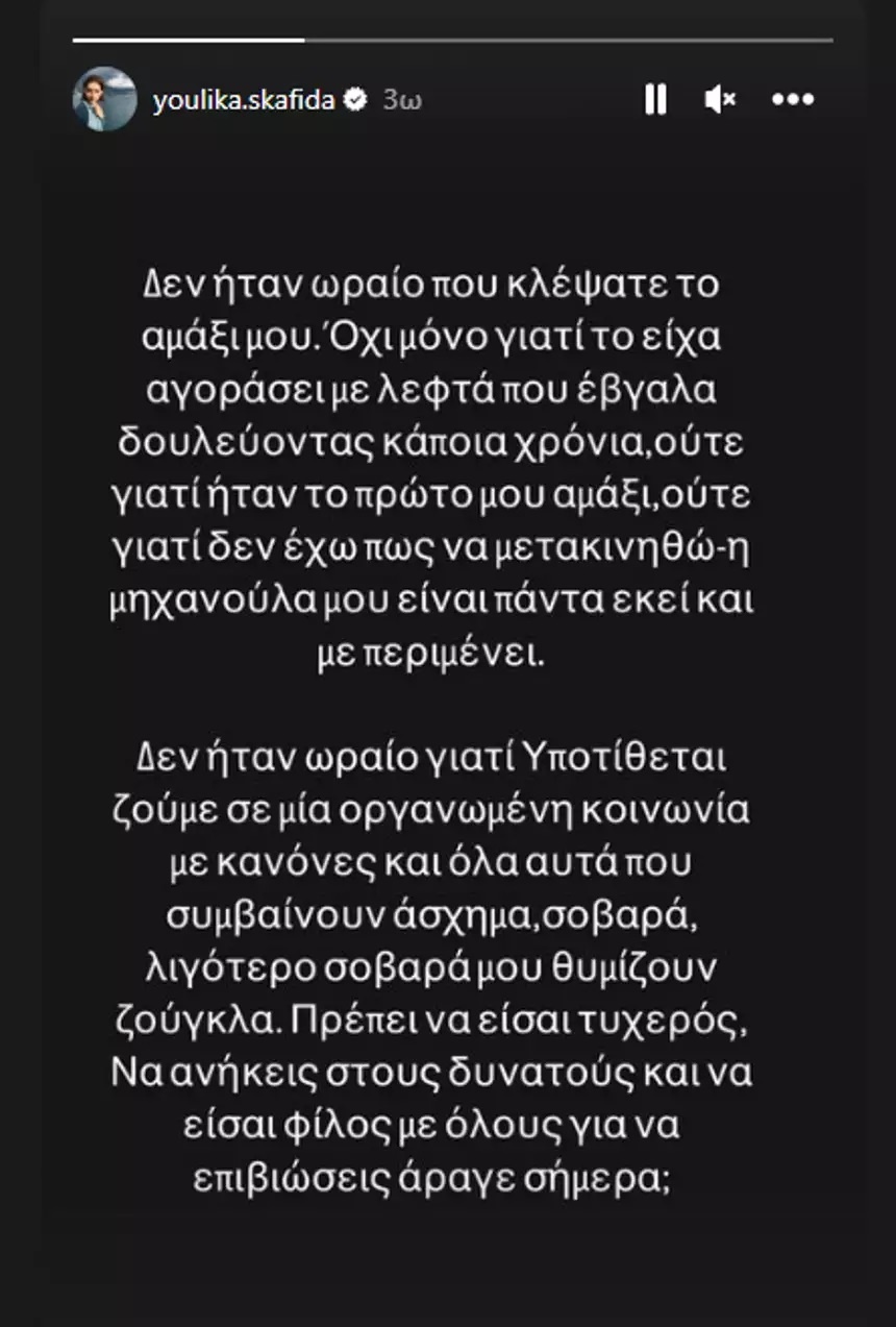 «Δεν ήταν ωραίο που κλέψατε το αμάξι μου. Όχι μόνο γιατί το είχα αγοράσει με λεφτά που έβγαλα δουλεύοντας κάποια χρόνια,ούτε γιατί ήταν το πρώτο μου αμάξι. Δεν ήταν ωραίο γιατί υποτίθεται ζούμε σε μία οργανωμένη κοινωνία με κανόνες και όλα αυτά που συμβαίνουν άσχημα, σοβαρά, λιγότερο σοβαρά μου θυμίζουν ζούγκλα. Πρέπει να είσαι τυχερός. Να ανήκεις στους δυνατούς και να είσαι φίλος με όλους για να επιβιώσεις άραγε σήμερα;» έγραψε χαρακτηριστικά η αγαπημένη ηθοποιός Γ. Σκαφιδά.