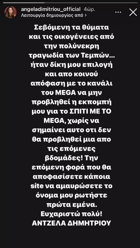 Με ένα στόρι στον προσωπικό της λογαριασμό στο Instagram ενημέρωσε η Άντζελα Δημητρίου τον λόγο που δεν θα προβληθεί το επεισόδιο – αφιέρωμα από την εκπομπή «σπίτι με το Mega».