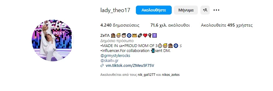 Πρόσφατα μάλιστα, η Ζέτα Θεοδωροπούλου προχώρησε σε μια σημαντική αλλαγή στον λογαριασμό της στο Instagram. Ενώ για χρόνια ήταν γνωστή ως @lady_taxtsidi77, τώρα ο λογαριασμός της έχει αλλάξει σε @lady_theo17. Όμως, παρά τον χωρισμό της από τον Παναγιώτη Ταχτσίδη, συνεχίζει να διατηρεί τις οικογενειακές φωτογραφίες με τον πρώην σύζυγό της στον λογαριασμό της.