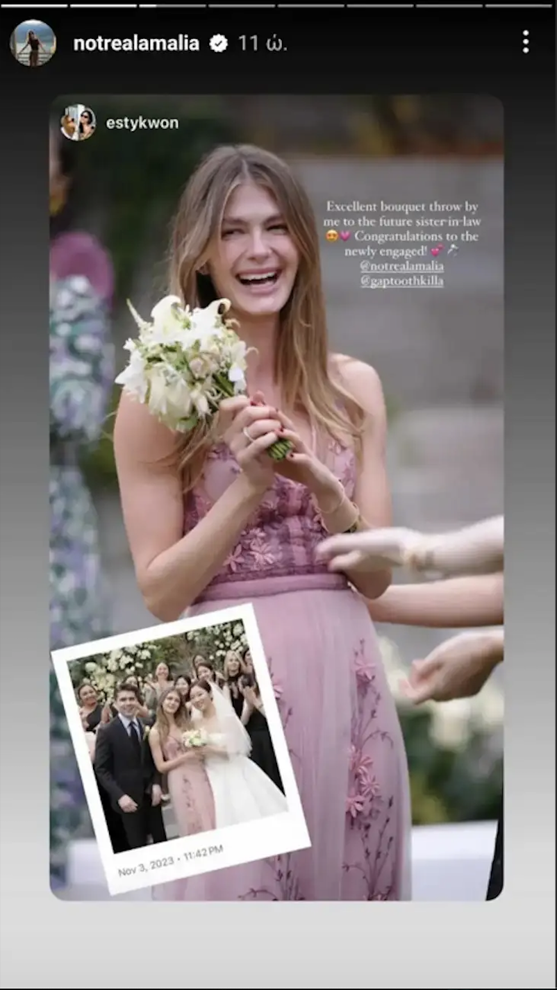 Η Αμαλία Κωστοπούλου ανάρτησε μια φωτογραφία στην οποία ποζάρει αγκαλιά με τον αγαπημένο της, χωρίς να σχολιάσει τις φήμες για τον αρραβώνα. Ωστόσο, φίλη της, που φαίνεται να είναι η αδελφή του συντρόφου της, έκανε την επίσημη αποκάλυψη γράφοντας: «Υπέροχο πέταγμα ανθοδέσμης στην μέλλουσα νύφη μου! Συγχαρητήρια στην φρέσκοαρραβωνιασμένη». Η Αμαλία έκανε repost τη συγκεκριμένη ανάρτηση, επιβεβαιώνοντας με αυτόν τον τρόπο το χαρμόσυνο γεγονός.