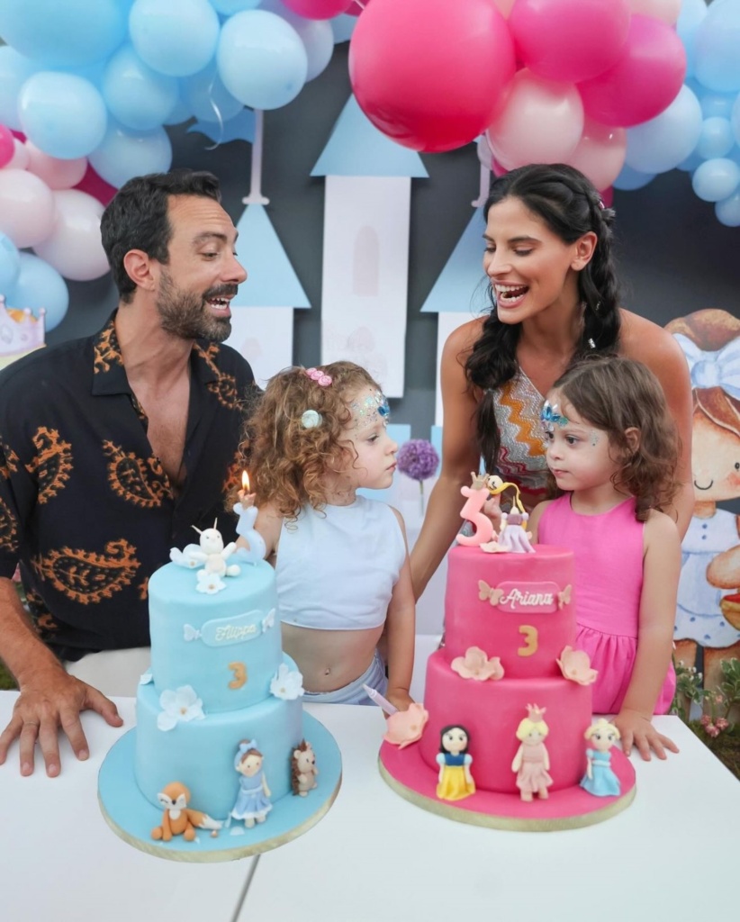 Η Αριάνα και η Φιλίππα είχαν ντυθεί ασορτί με τις τούρτες τους σε γαλάζιο και φούξια αντίστοιχα. Οι δίδυμες έσβησαν τα κεράκια με φόντο μπαλόνια και κάστρα με πριγκίπισσες.
