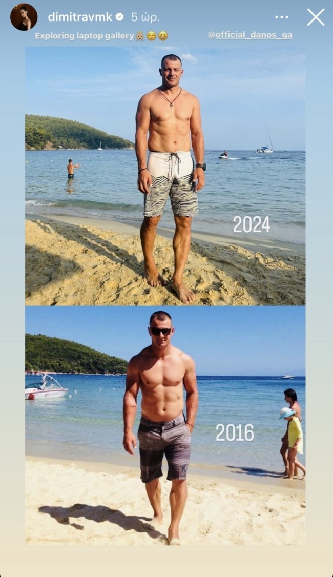 Στην άλλη φωτογραφία, βλέπουμε τον Ντάνο με το ίδιο κούρεμα, αλλά στην ίδια παραλία στη Σκιάθο. Η Δήμητρα δημιούργησε ένα κολάζ με τις δύο φωτογραφίες και το ανάρτησε σε ένα Instagram story.