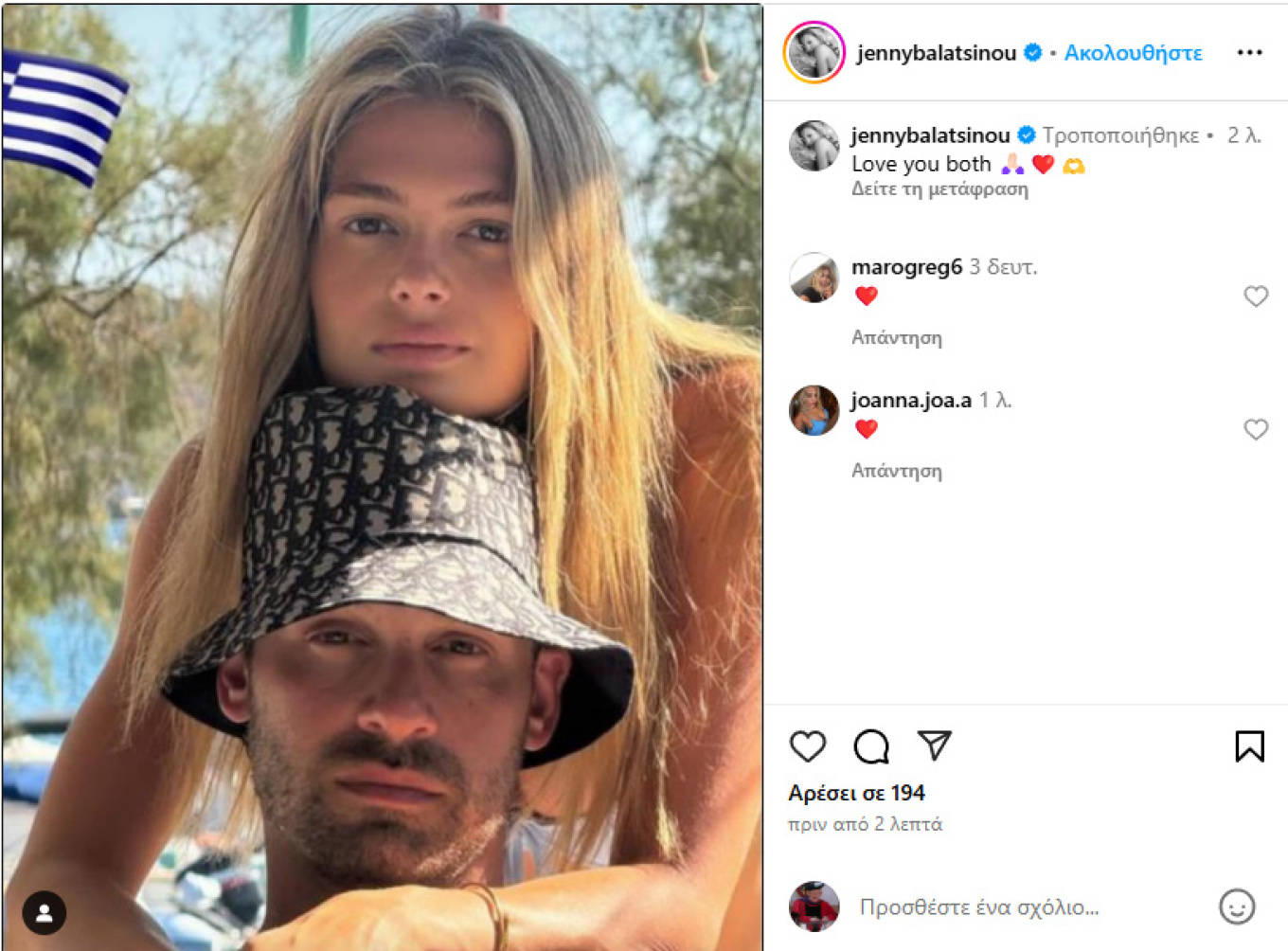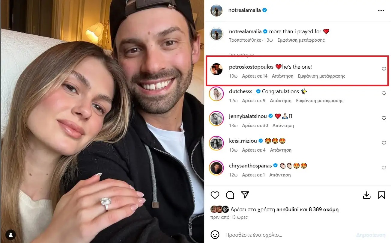Μάλιστα κάτω από την ανάρτηση με τον σύντροφό της, σχολίασε και ο πατέρας της μέλλουσας νύφης, Πέτρος Κωστόπουλος.