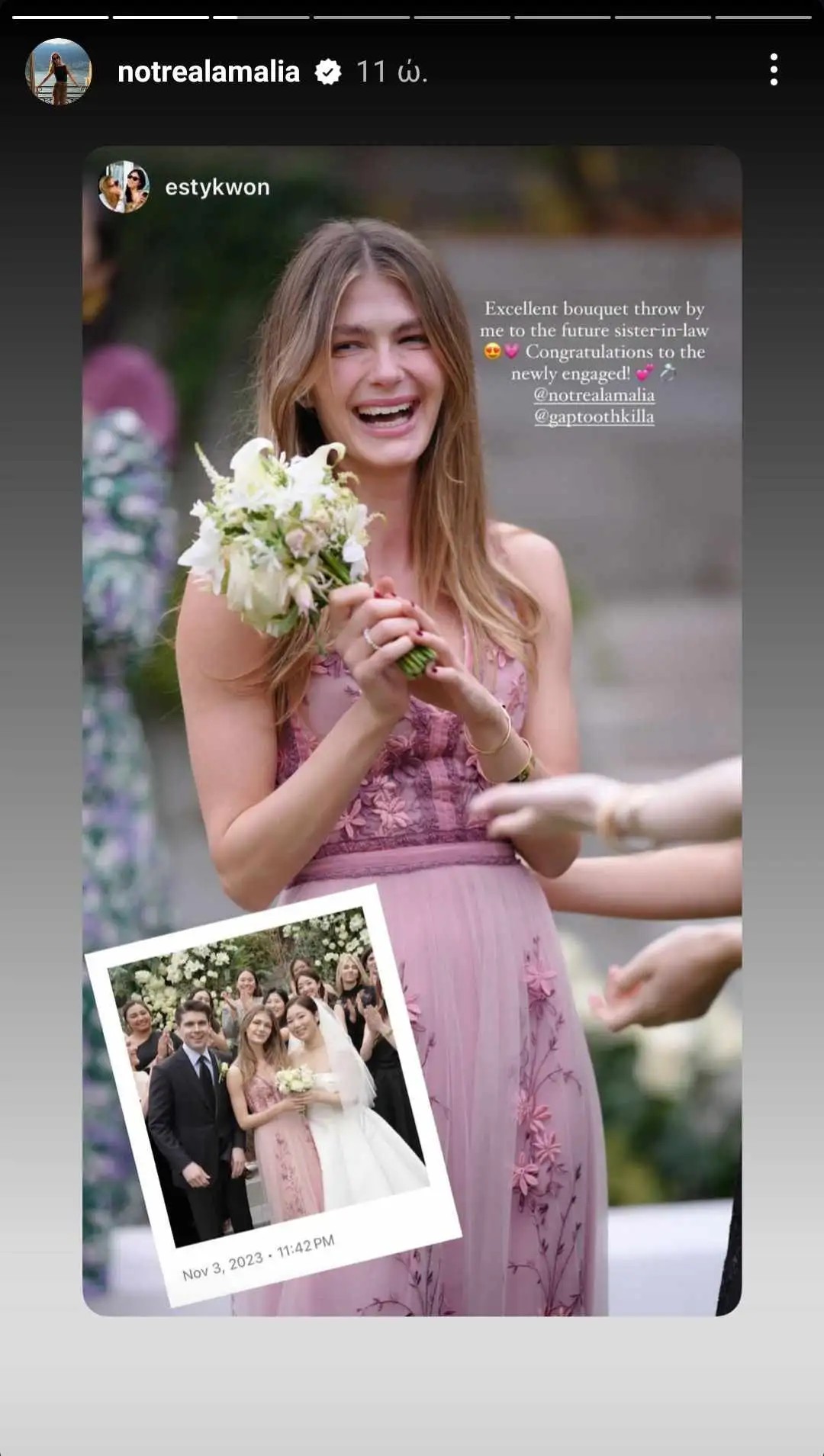 «Υπέροχο πέταγμα ανθοδέσμης στην μέλλουσα νύφη μου! Συγχαρητήρια στην φρέσκοαρραβωνιασμένη» έγραψε η φίλη της και όπως φαίνεται αδελφή του συντρόφου της, στα Instagram Stories της, με την Αμαλία Κωστοπούλου να κάνει repost.
