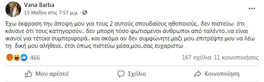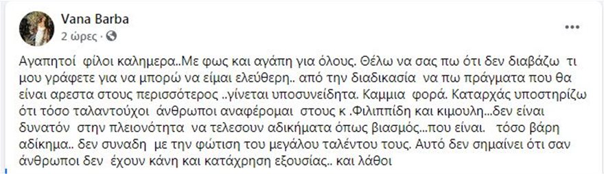 Βάνα Μπάρμπα: Οι αναρτήσεις που πραγματοποίησε στο Facebook για τον Πέτρο Φιλιππίδη και τον Γιώργο Κιμούλη
