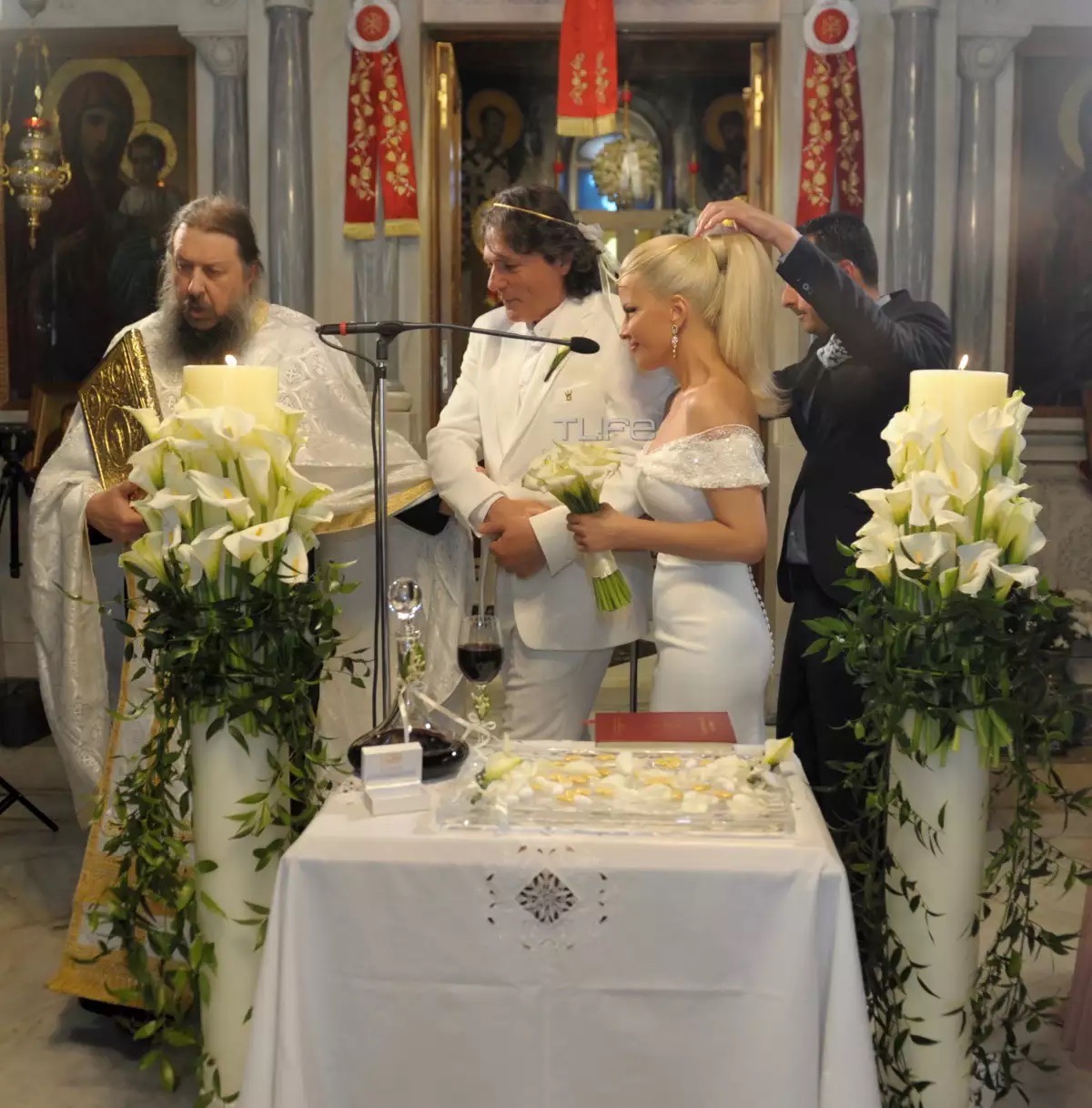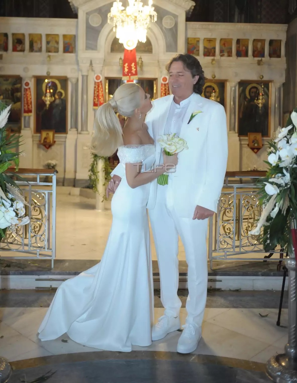 To σικάτo νυφικό είχε χειροποίητα κουμπιά κατά μήκος του και κατέληγε σε ουρά η οποία ανέβαινε και θηλύκωνε στο τελευταίο κουμπί, επιτρέποντας στη νύφη να χορεύει και να κινείται ελεύθερα μετά το μυστήριο. Το κοστούμι του γαμπρού, του γιου του και του πατέρα της νύφης, ήταν επίσης ιβουάρ sur mesure δημιουργίες του Ερωτόκριτου. Τα σκουλαρίκια της νύφης, τα χρυσά στέφανα, τα χρυσά μανικετόκουμπα του γαμπρού καθώς και τις μπομπονιέρες σχεδίασε αποκλειστικά για το ζευγάρι η επιστήθια φίλη της νύφης και γνωστή κοσμηματοποιός Νάντια Μπέλε.