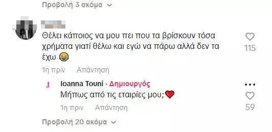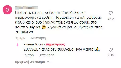 «Είμαστε κ εμείς που έχουμε 2 παιδάκια και περιμένουμε να έρθει η Παρασκευή να πληρωθούμε (1600 και οι δυο ) για να πάμε να ψωνίσουμε στο σούπερ μάρκετ και γενικά να βγει ο μήνας», της έγραψε ένας χρήστη του TikTok με την Ιωάννα Τούνη να απαντά «Συγγνώμη αλλά δεν ευθύνομαι εγώ γιαυτό».