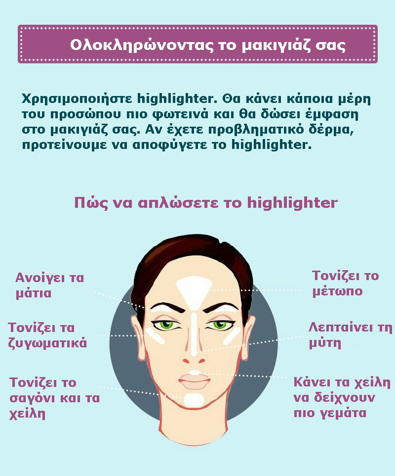 Τέλειο μακιγιάζ: Το να πετύχετε το τέλειο μακιγιαζ είναι κάτι πάρα πολύ δύσκολο. Ειδικά αν δεν έχετε κάποιον να σας συμβουλέψει τις πρώτες φορές. Για να έχετε το μακιγιαζ που θέλετε πρέπει να λάβετε υπόψιν σας πράγματα που δεν σας περνάνε εύκολα από το μυαλό. Για παραδειγμα θα πρέπει να λάβετε υπόψιν σας την απόχρωση του δέρματος σας και το τι ρουζ πάει με αυτό. Όπως επίσης και το τι σχήμα έχει το πρόσωπο σας. Ο παρακάτω οδηγός με τις φωτογραφίες θα σας δώσει ότι χρειαζετε να ξέρετε ως αναφορά το μακιγιαζ και το πως θα μπορέσετε να κάνετε το πρόσωπο σας να λάμψει.