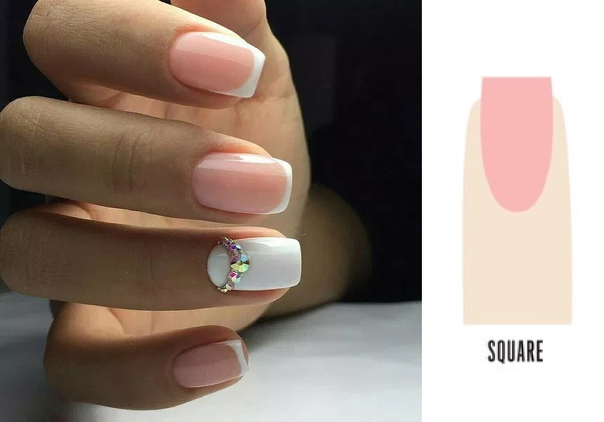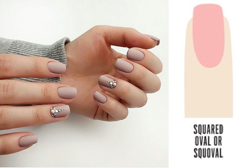 Ένα τετράγωνο σχήμα που ολοκληρώνεται με στρογγυλές άκρες είναι αυτό το hybrid-nail που πλέον έχει την ονομασία squoval. Αυτό είναι ένα καθολικά κολακευτικό σχήμα νυχιών που φαίνεται καλό τόσο σε κοντά όσο και σε μακριά δάχτυλα. Και εδώ, όλες εοι μονόχρωμες αποχρώσεις ταιριάζουν υπέροχα. Μια ακόμη πρόταση είναι το εναλλακτικό γαλλικό με διαφορετικά σχέδια και χρώματα.