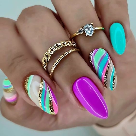 Φούξια, νέον κίτρινα νύχια, θαλασσί και λίγο γκλίτερ για να γίνει το μανικιούρ ακόμη πιο λαμπερό και να μαγνητίσει τα βλέμματα στις καλοκαιρινές διακοπές.