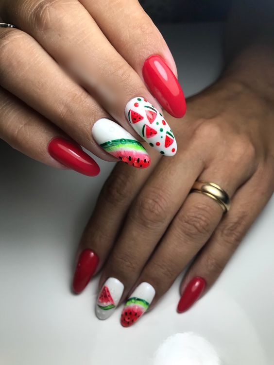 Κόκκινες φωτεινές αποχρώσεις στα νύχια με καρπουζάκια, θα βγάλουν στην επιφάνεια την παιχνιδιάρικη πλευρά σου.