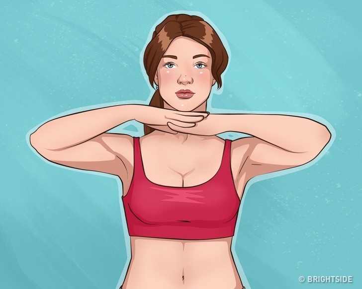 Σταθείτε όρθιες και κρατήστε τα χέρια σας σταυρωμένα μπροστά από το στήθος, με τις παλάμες στους αγκώνες. Προσπαθήστε να σηκώσετε τα χέρια σας, ενώ πιέζετε τους αγκώνες με τις παλάμες για να δημιουργηθεί ένταση.