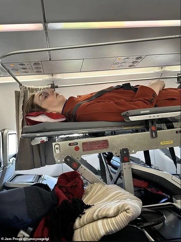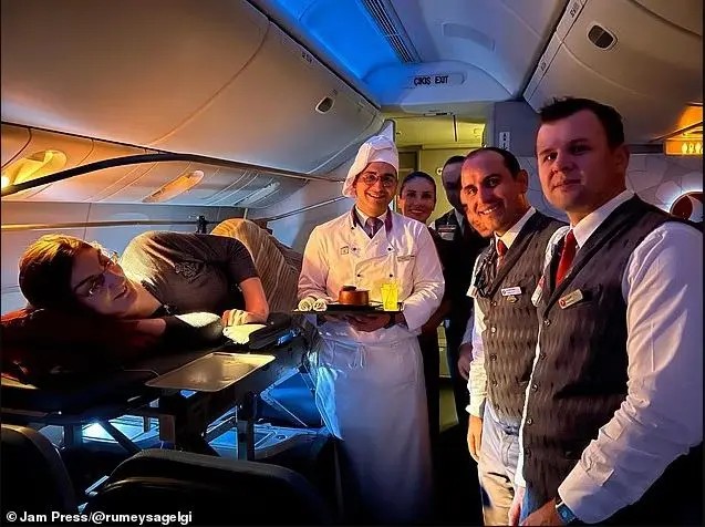 Λόγω του ύψους της, δεν χωράει στα καθίσματα του αεροπλάνου, ωστόσο η αεροπορική εταιρεία Turkish Airlines της έφτιαξε έναν ειδικά διαμορφωμένο χώρο: Αφαίρεσαι έξι καθίσματα σε ένα από τα αεροσκάφη της και τα αντικατέστησε με ένα ειδικά κατασκευασμένο φορείο ώστε η Rumeysa να μπορεί να «πετάει» ξαπλωμένη.