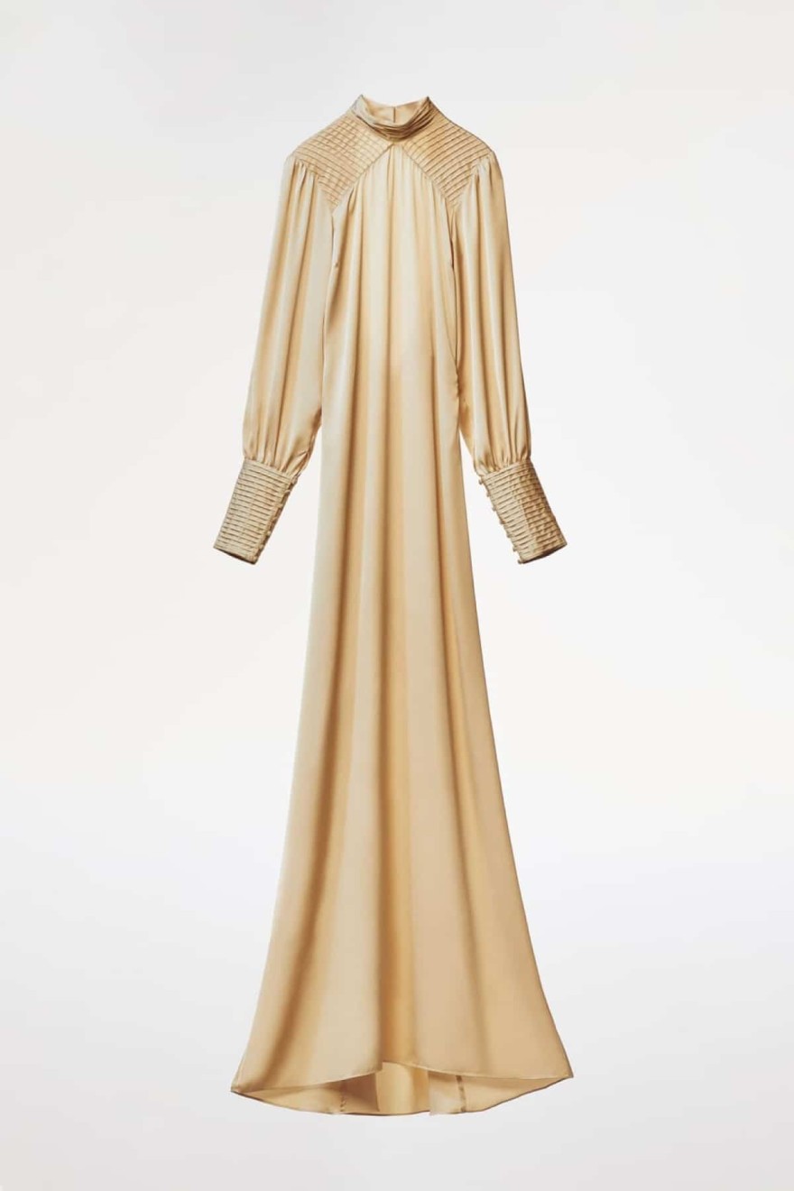 Μακρύ φόρεμα σατινέ με όρθιο γιακά και μακριά μανίκια, που καταλήγουν σε μανσέτες και φοδραρισμένα κουμπιά από το ίδιο ύφασμα. Λεπτομέρεια με νερβίρ και πιέτες, άνοιγμα στο πίσω μέρος και κλείσιμο στο γιακά με κουμπιά, ο οποίο κοστίζει μόλις 129 ευρώ.