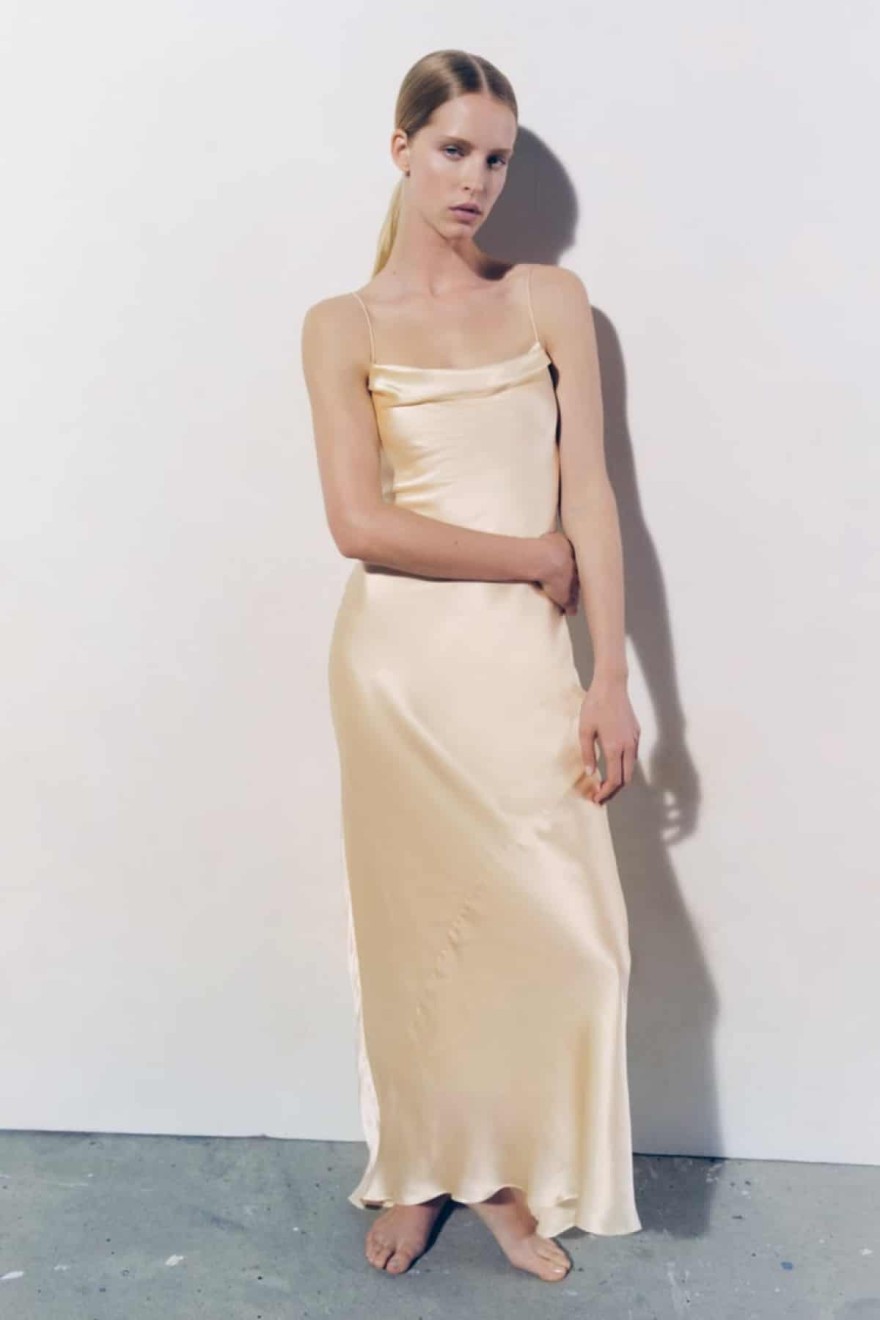 Μακρύ φόρεμα με ντεκολτέ σε ριχτή γραμμή και λεπτές ρυθμιζόμενες τιράντες. Ασύμμετρο κάτω μέρος και κλείσιμο στην πλάτη με φοδραρισμένο κουμπί από το ίδιο ύφασμα, το οποίο κοστίζει 129 ευρώ.