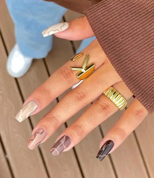 Αν θες να δώσεις μια πιο ενδιαφέρουσα πινελιά στο μανικιούρ σου, μπορείς να δοκιμάσεις την τάση των rainbow nails, δηλαδή να βάψεις κάθε νύχι σε διαφορετική απόχρωση του καφέ.