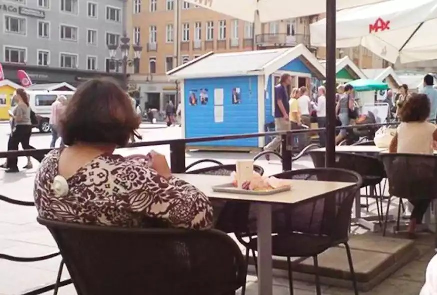 Μία κυρία απολαμβάνει το γεύμα της σε μια υπαίθρια καφετέρια. Γύρω της κόσμος περπατά, τρώει, μιλά.