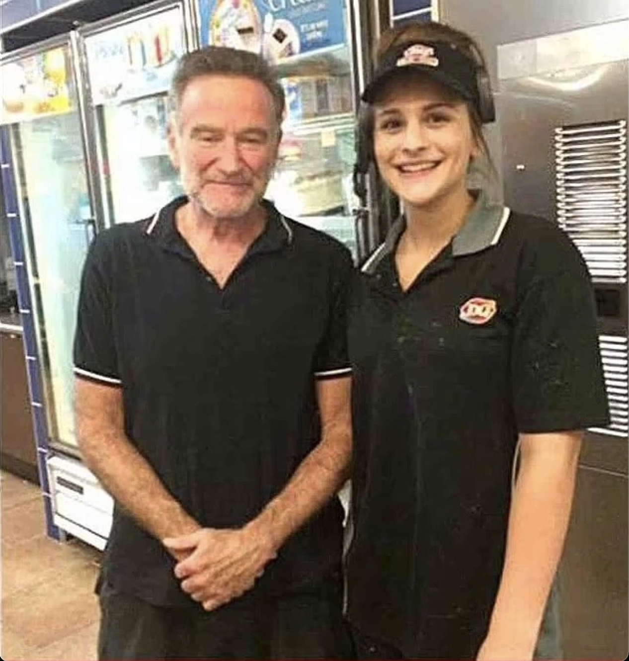 Εμφανιζόμενος κάπως σκυθρωπός και αδύναμος, ο αγαπημένος ηθοποιός Robin Williamsφαίνεται να ποζάρει με τη σερβιτόρα Abby Albers σε ένα παγωτατζίδικο Dairy Queen στο Lindstrom της Μινεσότα, στις 29 Ιουνίου 2014.