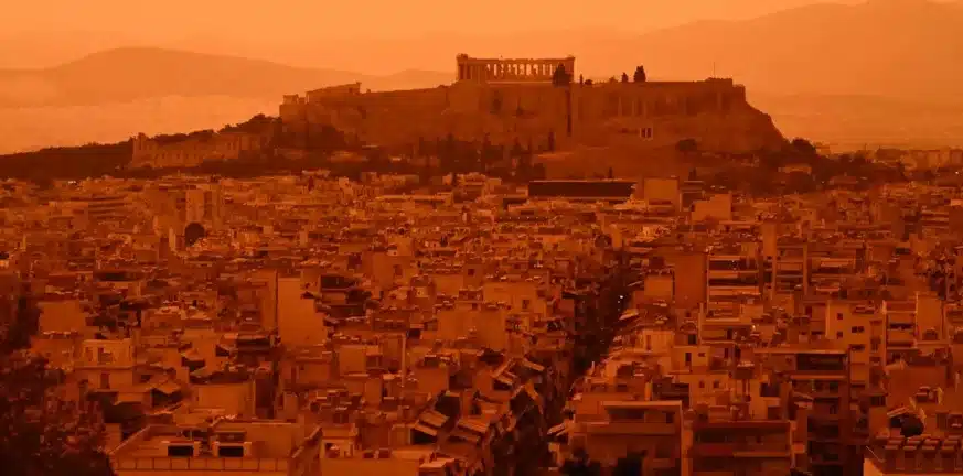 Λίγες ώρες πριν οι βροχές και οι καταιγίδες επισκεφτούν την Ελλάδα, η αφρικανική σκόνη φαίνεται να επηρεάζει σημαντικά τη Στερεά Ελλάδα και ιδιαίτερα την Αθήνα.