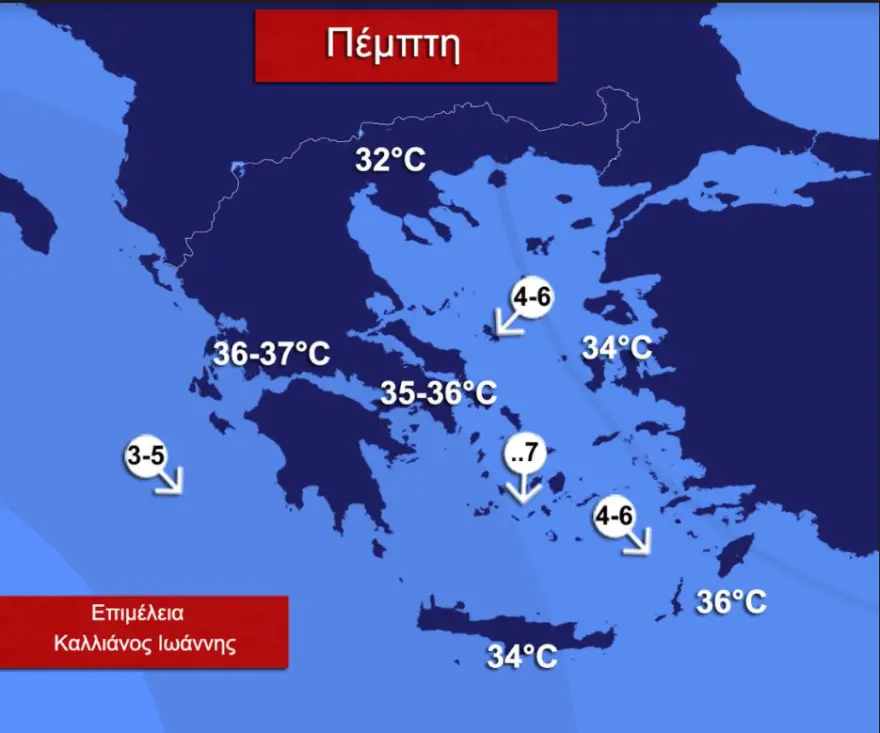 Η θερμοκρασία θα κυμανθεί από 36 έως 37 βαθμούς Κελσίου. Το Σαββατοκύριακο ο υδράργυρος δεν θα ξεπεράσει τους 34 βαθμούς Κελσίου.