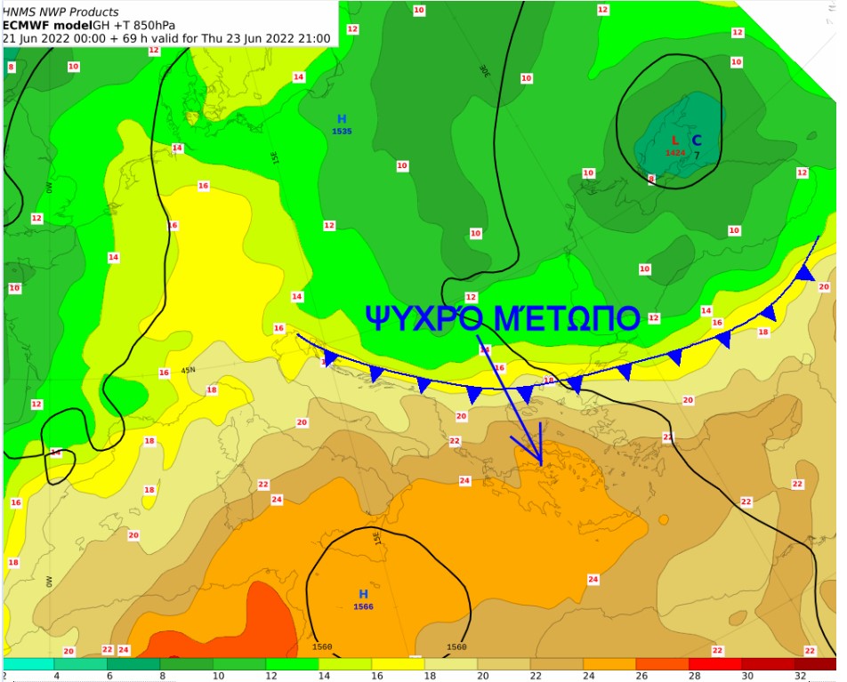 Το μέτωπο αυτό θα ρίξει αισθητά την θερμοκρασία και στους προγνωστικούς χάρτες το βράδυ της Παρασκευής προς Σάββατο εμφανίζεται να περνά πάνω από την Αθήνα η ισόθερμη των 15 βαθμών Κελσίου.