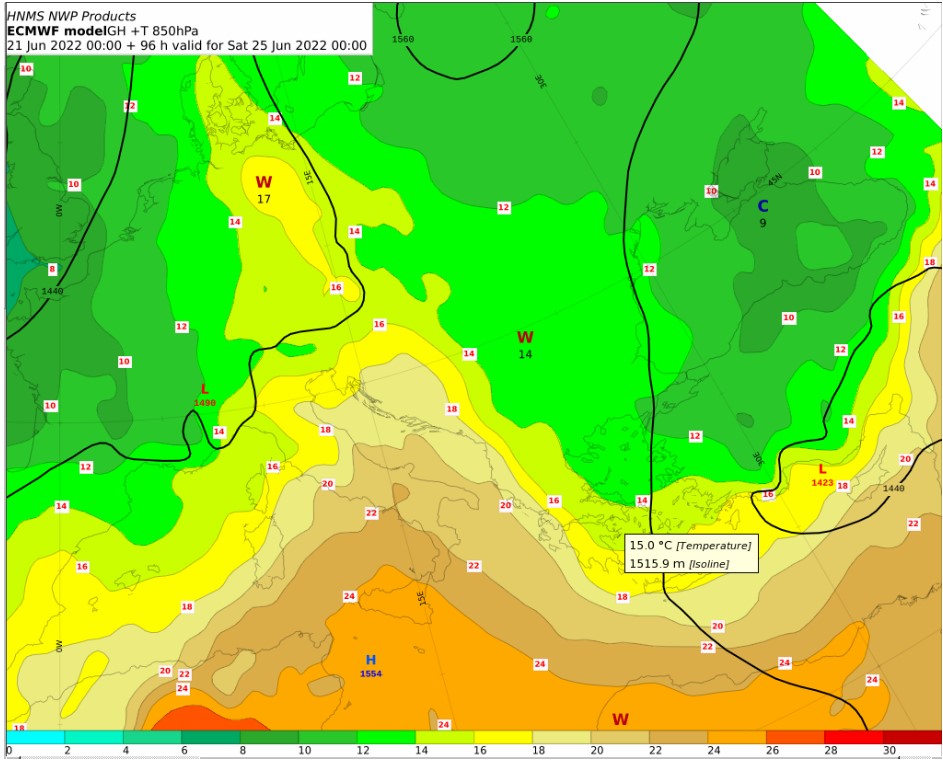 Για την περαιτέρω εξέλιξη του καιρού υπάρχει η τάση νέας ανόδου από την Κυριακή και μετά – αλλά δεν μπορούμε να μιλάμε ότι θα έχουμε συνθήκες καύσωνα.