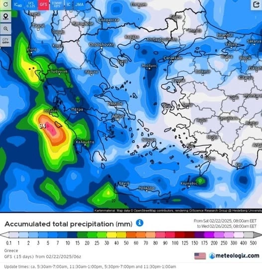 Στον προγνωστικό χάρτη που έχει δημοσιευθεί, διακρίνεται ο συνολικός υετός που αναμένεται από την Κυριακή έως την Τετάρτη, με τα εντονότερα φαινόμενα να εντοπίζονται στο Ιόνιο και τα δυτικά ηπειρωτικά. Η εξέλιξη της κακοκαιρίας θα παρακολουθείται στενά, με τις επόμενες ενημερώσεις να αποσαφηνίζουν την πορεία του καιρού για το επερχόμενο τριήμερο.