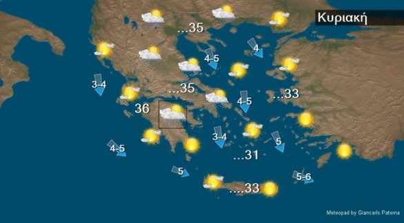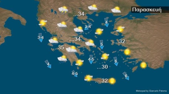 Στη Μακεδονία και στην ανατολική Θεσσαλία προβλέπονται νεφώσεις με τοπικούς όμβρους ή μεμονωμένες καταιγίδες και βελτίωση από το βράδυ. Στα υπόλοιπα ηπειρωτικά (εκτός από την Θράκη και το ανατολικό τμήμα της Στερεάς) και τα νησιά του Ιονίου τις μεσημβρινές και απογευματινές ώρες θα αναπτυχθούν νεφώσεις και θα εκδηλωθούν τοπικοί όμβροι ή μεμονωμένες καταιγίδες κυρίως στα ορεινά. Στην ανατολική νησιωτική χώρα προβλέπεται γενικά αίθριος καιρός. Οι άνεμοι θα πνέουν στα δυτικά μεταβλητοί 3 με 4 μποφόρ και στα ανατολικά βόρειοι βορειοδυτικοί έως 5 και στο Αιγαίο τοπικά 6 μποφόρ. Η θερμοκρασία θα σημειώσει μικρή πτώση κυρίως στα δυτικά και θα φτάσει στο Ιόνιο και τα ηπειρωτικά τους 33 βαθμούς, στο Αιγαίο τους 28 με 30 ενώ στα Δωδεκάνησα και τη νότια Κρήτη τους 32 βαθμούς Κελσίου.