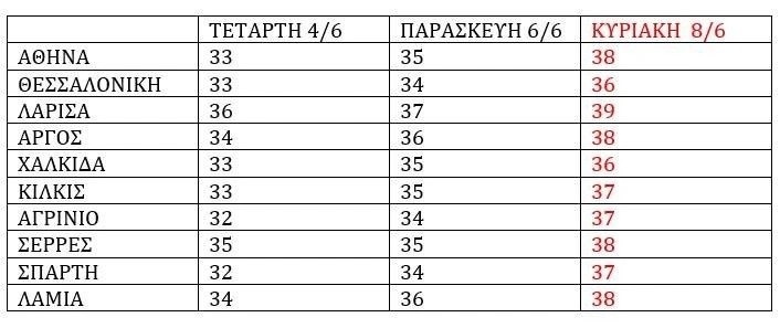 Παραθέτει, δε, ενδεικτικά την πορεία της θερμοκρασίας σε 10 πόλεις: