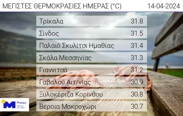 Σύμφωνα με τα στοιχεία του meteo, την Κυριακή η θερμοκρασία προσέγγισε τους 32 βαθμούς Κελσίου σε Τρίκαλα, Σίνδο, Ημαθία και Μεσσηνία. Η θερμοκρασία, σύμφωνα με την πρόγνωση του καιρού, θα αρχίζει να παρουσιάζει κάποια πτώση από την Τετάρτη.