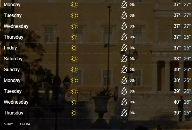 Σύμφωνα με την πρόγνωση θερμοκρασιών της εφαρμογής Yahoo, την επόμενη εβδομάδα αναμένεται νέα άνοδος της θερμοκρασίας, με την Αθήνα να φτάνει έως και τους 40 βαθμούς Κελσίου. Παρ’ όλα αυτά, αυτή η πρόβλεψη είναι βραχυχρόνια και μένει να επιβεβαιωθεί ή να διαψευστεί από τα προγνωστικά μοντέλα τις προσεχείς ημέρες.