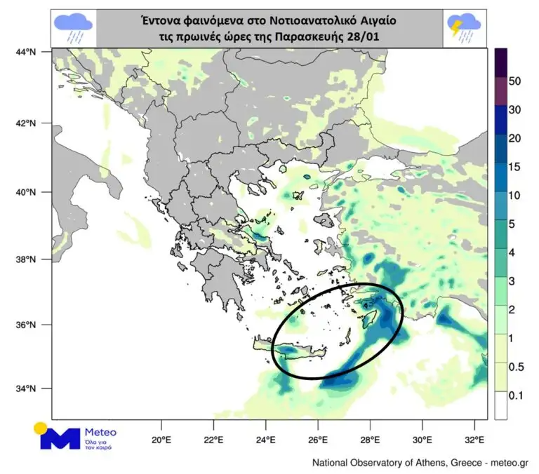 Μετά το μεσημέρι κατά τόπους ισχυρές βροχές και καταιγίδες προβλέπονται στα νησιά του Ανατολικού Αιγαίου και την Κρήτη (κυρίως τη δυτική και νότια), ενώ από το βράδυ θα επηρεαστούν με έντονα φαινόμενα και τα Δωδεκάνησα.