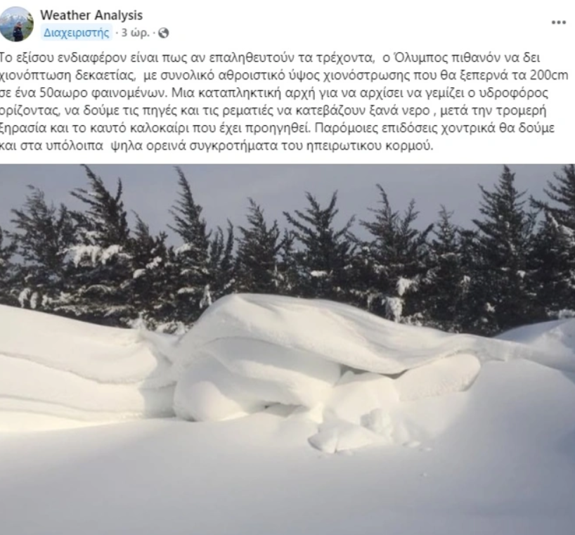«Το εξίσου ενδιαφέρον είναι πως αν επαληθευτούν τα τρέχοντα, ο Όλυμπος πιθανόν να δει χιονόπτωση δεκαετίας, με συνολικό αθροιστικό ύψος χιονόστρωσης που θα ξεπερνά τα 200cm σε ένα 50αωρο φαινομένων. Μια καταπληκτική αρχή για να αρχίσει να γεμίζει ο υδροφόρος ορίζοντας, να δούμε τις πηγές και τις ρεματιές να κατεβάζουν ξανά νερο , μετά την τρομερή ξηρασία και το καυτό καλοκαίρι που έχει προηγηθεί. Παρόμοιες επιδόσεις χοντρικά θα δούμε και στα υπόλοιπα ψηλα ορεινά συγκροτήματα του ηπειρωτικου κορμού», αναφέρει σχετική ανάρτηση στην ομάδα στο facebook, Weather Analysis.
