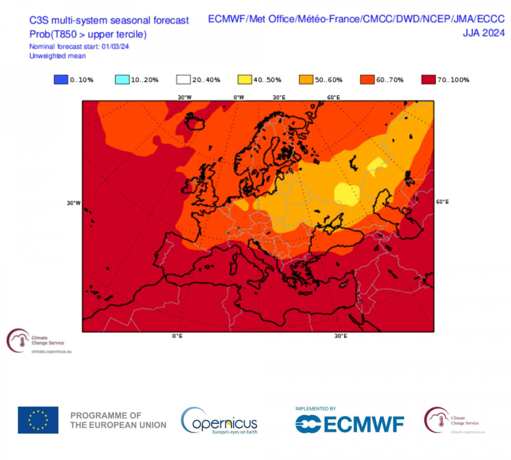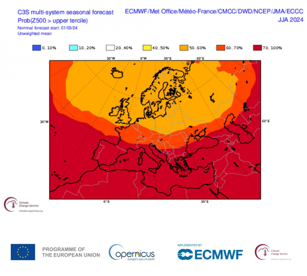 «Αρκετα ανησυχητικη ειναι η τελευταια ανανεωση του μουλτιενσεμπλ των μακροπροθεσμων μοντελων για το καλοκαιρι(Ιουνιος-Ιουλιος-Αυγουστος) 2025, μιας και δινουν για την Μεσογειο αλλά και για Ευρωπη γενικα ακομα πιο γενικευμενη περιοχη με πιθανοτητες να εχει γεωδυναμικα υψη στα 500 hPa αλλά και θερμοκρασιες στα 850 hPa στο ανω οριο της κλιματολογιας(υψηλα γεωδυναμικα και υψηλες θερμορκασιες δηλαδη), σε σχεση με το καλοκαιρι 2024.