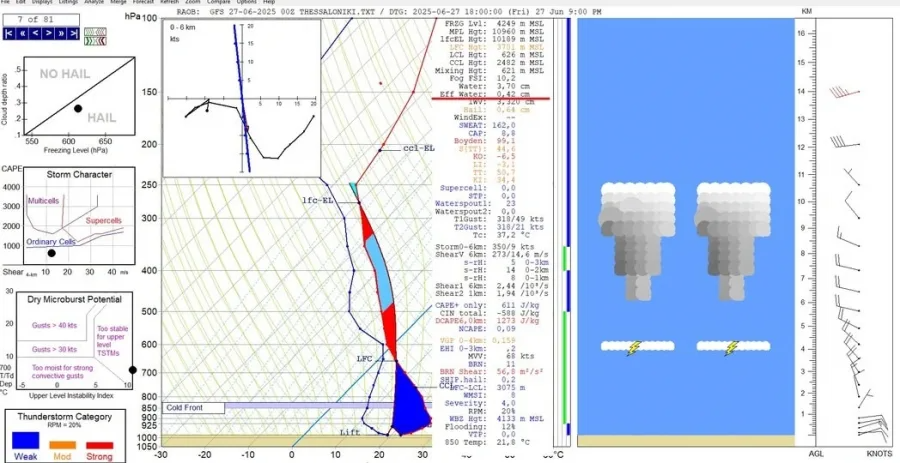 Σύμφωνα με το Weather Analysis Greece, βλέποντας το κατακόρυφο προφίλ της τροπόσφαιρας για απόψε, φαίνεται πως θα περπατήσει ένα αρκετά καλο αίτιο (τραφάκι) κατά μήκος των συνόρων μας, ενώ αυτό θα συναντήσει εξαιρετικά μεγάλα ποσά διαθέσιμης ενέργειας ( αστάθεια) λόγω της ζέστης αλλά και της θαλάσσιας αύρας που τροφοδοτεί με υγρασία την όλη κατάσταση.