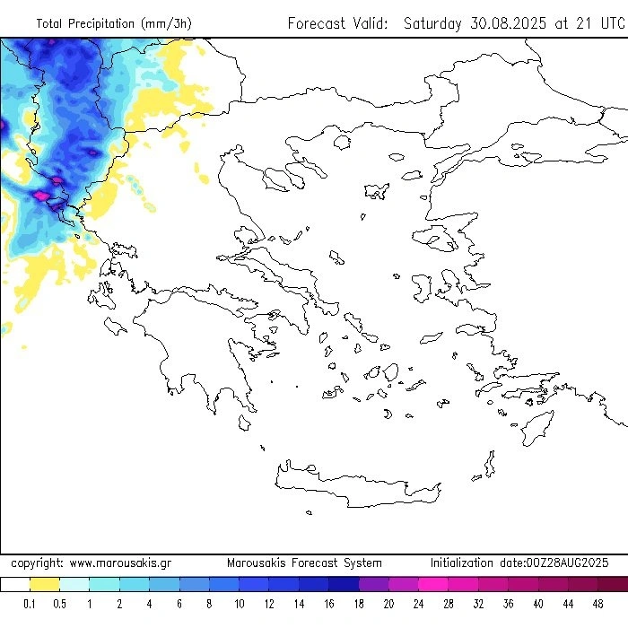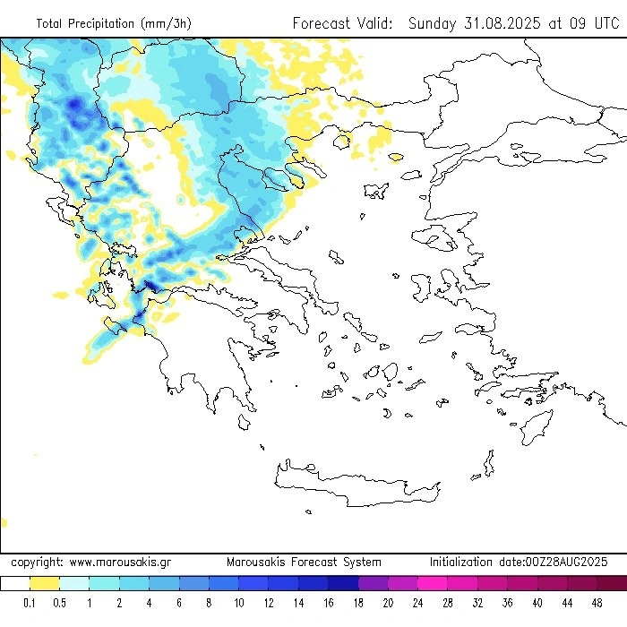 3. Βροχές και καταιγίδες από το απόγευμα του Σαββάτου αρχικά στα βορειοδυτικά και μέσα στην Κυριακή σε αρκετές περιοχές της δυτικής, κεντρικής και βόρειας χώρας. Επισημαίνεται ότι τα φαινόμενα αυτά και με έμφαση τα δυτικά – βόρεια – βορειοδυτικά τμήματα θα είναι τοπικά ισχυρά και επικίνδυνα, ενώ πολύ πιθανό να συνοδεύονται από χαλάζι και μεγάλη συχνότητα κεραυνών.