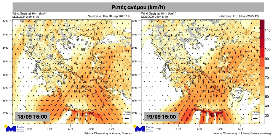 Σύμφωνα με τα νεότερα προγνωστικά στοιχεία του Εθνικού Αστεροσκοπείου Αθηνών/meteo.gr, η ανάπτυξη ενός πεδίου υψηλών πιέσεων πάνω από τα Βαλκάνια κατά τη διάρκεια της Πέμπτης 18 Σεπτεμβρίου 2025 θα έχει ως αποτέλεσμα την σημαντική ενίσχυση των βορείων ανέμων κυρίως στο Αιγαίο και στα ανατολικά ηπειρωτικά. Συγκεκριμένα, κατά τη διάρκεια της Πέμπτης 18/09 και της Παρασκευής 19/09, οι άνεμοι θα πνέουν με εντάσεις έως 6-7 μποφόρ και τοπικά πιθανώς έως 8 μποφόρ, ενώ οι ριπές του ανέμου αναμένεται να ξεπεράσουν κατά τόπους τα 70-80 km/h, όπως διακρίνεται και στο παρακάτω γράφημα.