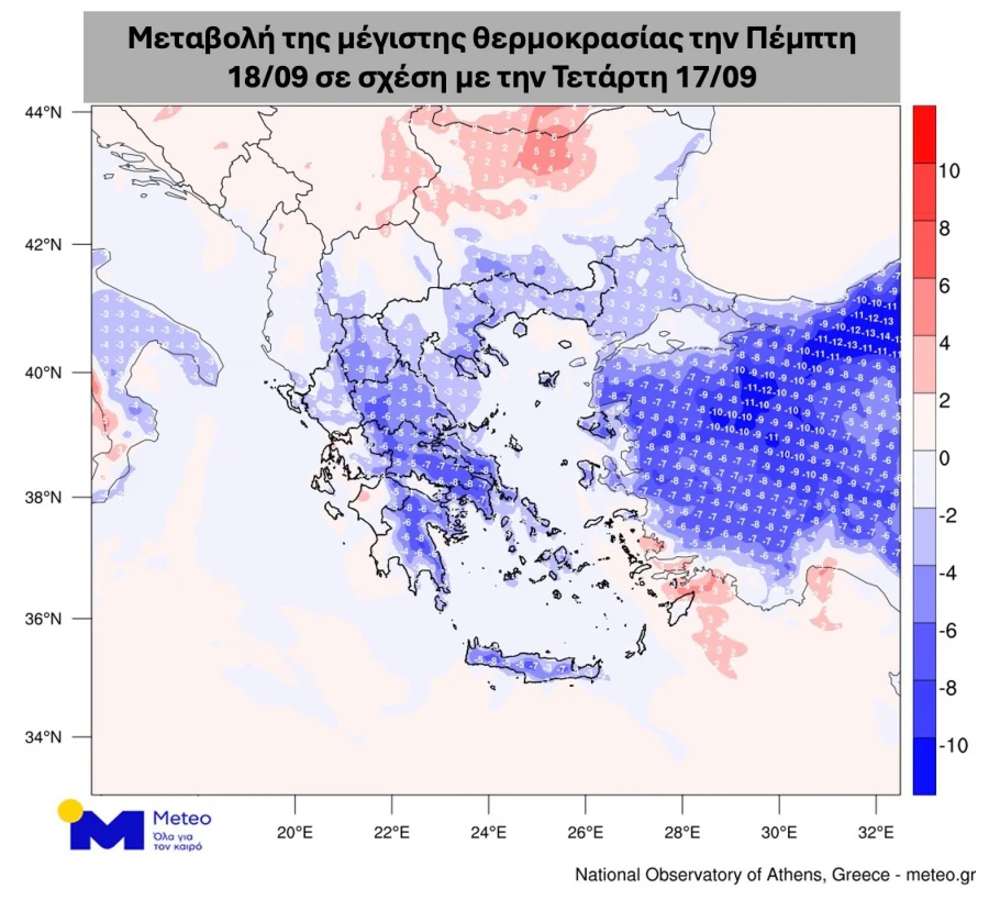 Παράλληλα, κατά τη διάρκεια της Πέμπτης 18/09 αναμένεται η μεταφορά ψυχρότερων αερίων μαζών προς τη χώρας μας και η θερμοκρασία αναμένεται να σημειώσει πτώση έως 5-6 βαθμούς Κελσίου σε σχέση με τις μέγιστες θερμοκρασίες της Τετάρτης 17/09, όπως διακρίνεται και στο παρακάτω γράφημα.