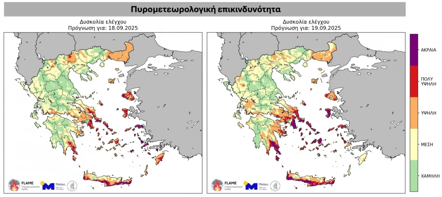 Η σημαντική ενίσχυση των βόρειων ανέμων θα έχει ως αποτέλεσμα τον πολύ υψηλό πυρομετεωρολογικό κίνδυνο σε τμήματα της Αττικής, Βοιωτίας, Κ. και Ν. Εύβοιας, Αν. Αργολίδας, Λακωνίας, του Αιγαίου και της Ν. Κρήτης. Σε αυτές τις περιοχές αναμένεται υψηλή έως πολύ υψηλή δυσκολία ελέγχου σε περίπτωση έναρξης πυρκαγιών όπως διακρίνεται και στο παρακάτω γράφημα.