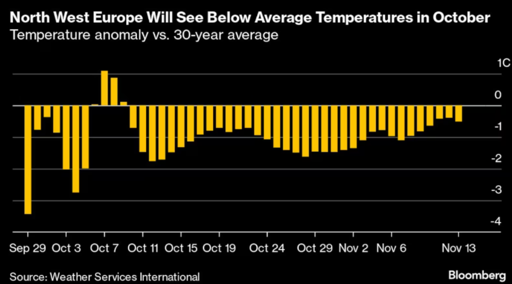 Οπως μεταδίδει το Bloomberg, η Γαλλία, το Ηνωμένο Βασίλειο και η Σκανδιναβία θα είναι τα πιο κρύα μέρη της Ευρώπης κατά τη διάρκεια του Οκτωβρίου, σύμφωνα με τους μετεωρολόγους.