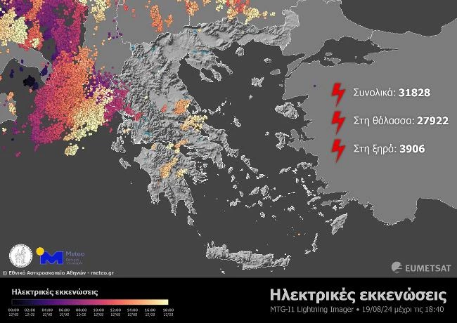 Σύμφωνα με αναφορές του meteo, από τα μεσάνυχτα έως τις 18:40 της Δευτέρας 19 Αυγούστου, καταγράφηκαν συνολικά 31.828 αστραπές και κεραυνοί, εκ των οποίων 3.906 σημειώθηκαν στη ξηρά και 27.922 πάνω από τη θάλασσα.