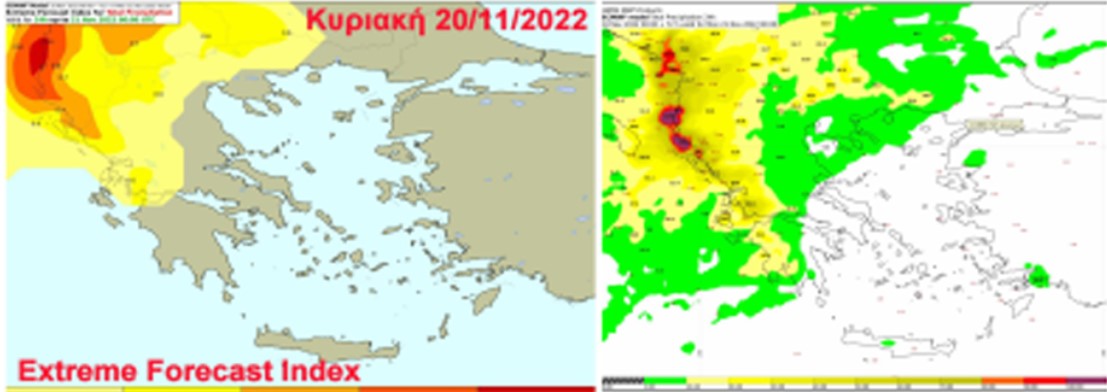 Την Κυριακή στο Ιόνιο, τα δυτικά και τα βόρεια ηπειρωτικά και βαθμιαία στα υπόλοιπα ηπειρωτικά και το βόρειο Αιγαίο, θα έχουμε βροχές και σποραδικές καταιγίδες. Τα φαινόμενα στα δυτικά και κυρίως στα βορειοδυτικά όπως διακρίνεται και στους δύο χάρτες (στον δείκτη EFI και τον 24ωρο υετό) πιθανώς να είναι ισχυρά (με πορτοκαλί δείκτη EFI -Extreme Forecast Index- επιπέδου 0,7.