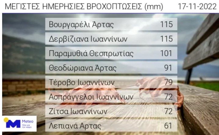 Μεγάλα ύψη βροχής σημειώθηκαν στα βορειοδυτικά τμήματα της χώρας μας και συγκεκριμένα στην Ήπειρο, επαληθεύοντας την τελευταία ανακοίνωση του Εθνικού Αστεροσκοπείου Αθηνών / Meteo.gr, με το μεγαλύτερο ύψος βροχής έως τις απογευματινές ώρες της Πέμπτης 17/11 να καταγράφεται στο Βουργαρέλι Άρτας και στα Δερβίζιανα Ιωαννίνων με 115 mm. Υπενθυμίζεται ότι 1 mm, αντιστοιχεί σε 1 λίτρο βροχής σε επιφάνεια 1 τετραγωνικού μέτρου.