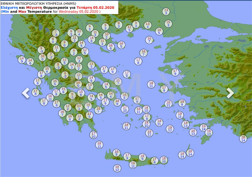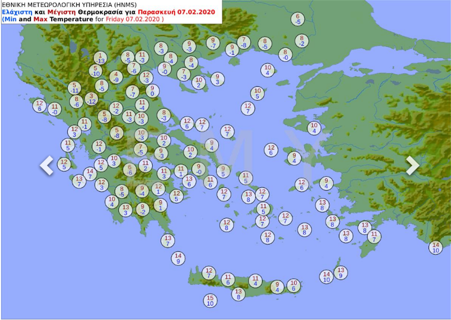 Η θερμοκρασία στη Δυτική Μακεδονία θα κυμανθεί από -5 έως 6 βαθμούς, στην υπόλοιπη Μακεδονία και στη Θράκη από -1 έως 13, στη Θεσσαλία από 4 έως 12, στα δυτικά ηπειρωτικά από 6 έως 14, στα υπόλοιπα ηπειρωτικά από 6 έως 12, στα νησιά του Ιονίου από 8 έως 12, στα νησιά του Βορείου Αιγαίου από 7 έως 13, στα νησιά του υπολοίπου Αιγαίου από 8 έως 16 και στην Κρήτη από 8 έως 20. Σημειώνεται ότι η ελάχιστη θερμοκρασία αναμένεται προς το τέλος του εικοσιτετραώρου.