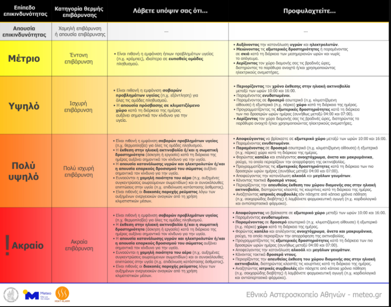 Η επικινδυνότητα είναι ιδιαίτερα υψηλή για ηλικιωμένους (άνω των 65 ετών), ειδικά για ηλικιωμένες γυναίκες, και για ανθρώπους που εργάζονται σε εξωτερικούς χώρους. Η εφαρμογή μέτρων προστασίας, όπως η αποφυγή εξωτερικών δραστηριοτήτων μεταξύ 10:00 και 16:00, είναι απολύτως απαραίτητη για την προστασία της υγείας. Περισσότερες πληροφορίες παρέχονται στην επόμενη εικόνα.