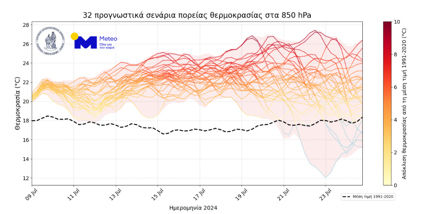 Το γράφημα του meteo που ακολουθεί παρουσιάζει 32 προγνωστικά σενάρια από τις 9 έως 24 Ιουλίου 2024 από το Εθνικό Κέντρο Περιβαλλοντικών Προγνώσεων των ΗΠΑ, για την πορεία της θερμοκρασίας σε ύψος περίπου 1.500 μ πάνω από τη μέση στάθμη της θάλασσας, ύψος στο οποίο μελετούμε την πορεία των αερίων μαζών. Βλέπουμε ότι προβλέπονται μεγάλες θετικές αποκλίσεις τιμών θερμοκρασίας από τη μέση κλιματική τιμή της περιόδου 1991-2020 σχεδόν από το σύνολο των σεναρίων, ιδιαίτερα μετά τις 14 Ιουλίου. Χαρακτηριστικό των επόμενων ημερών θα είναι ότι η μέγιστη ημερήσια τιμή της θερμοκρασίας θα ξεπερνά καθημερινά τους 38-40 °C σε πολλές περιοχές της χώρας μας, φτάνοντας σε επίπεδα 6-8 °C πάνω από τις κανονικές για την εποχή τιμές.