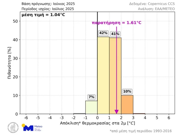 Όσον αφορά τον περασμένο Ιούλιο, η μέση θερμοκρασιακή απόκλιση στην ΝΑ Ευρώπη ήταν +1.61°C, ενώ η μέση τιμή όλων των σεναρίων της μακροπρόθεσμης πρόγνωσης που εκδόθηκε τον Ιούνιο του 2025 ήταν +1.04°C. Όπως φαίνεται στο παρακάτω γράφημα (Εικόνα 3), το μέγεθος της απόκλισης που παρατηρήθηκε είχε πιθανότητα 41% και ήταν το 2ο πιθανότερο πεδίο τιμών στην μακροπρόθεσμη πρόγνωση.