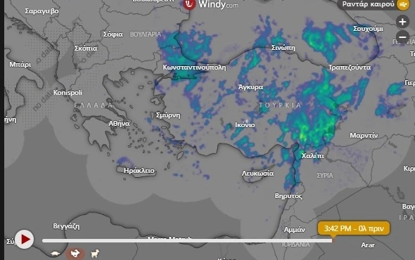 Tο ραντάρ με τον καιρό ΤΩΡΑ, μέσα από το WINDY που χρησιμοποιεί τα προγνωστικά μοντέλα GFS, ECMWF και NEMS