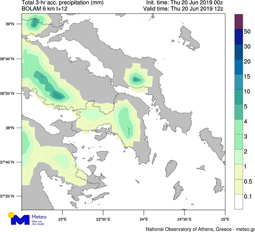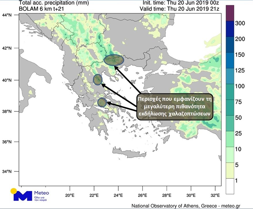 Στον χάρτη που ακολουθεί παρουσιάζονται τα εκτιμώμενα ύψη βροχής για σήμερα ενώ με κύκλους επισημαίνονται οι περιοχές που εμφανίζουν τη μεγαλύτερη πιθανότητα για εκδήλωση χαλαζοπτώσεων.
